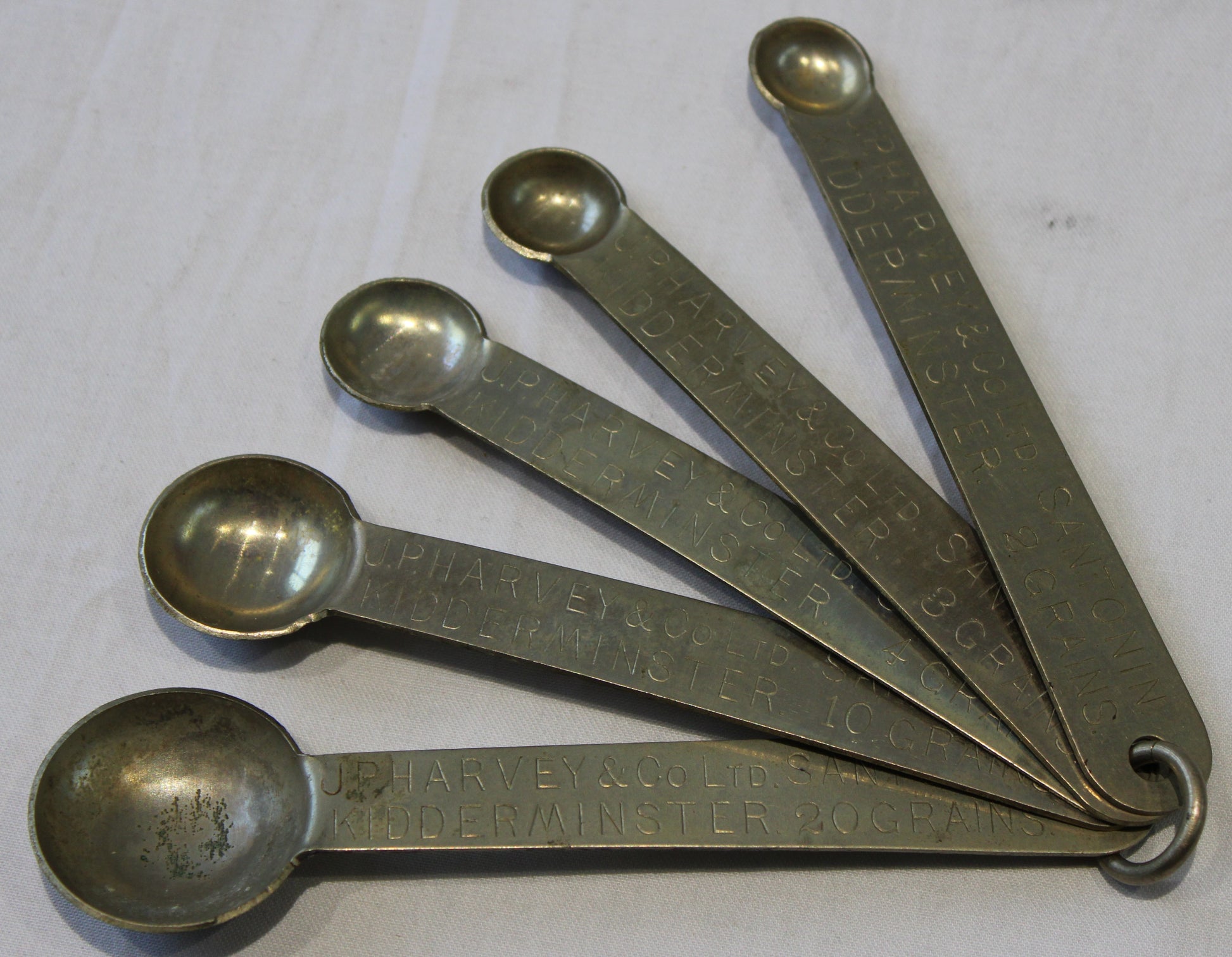 Antique JP Harvey & Co, Kidderminster veterinary Santonin grain measuring spoon set.