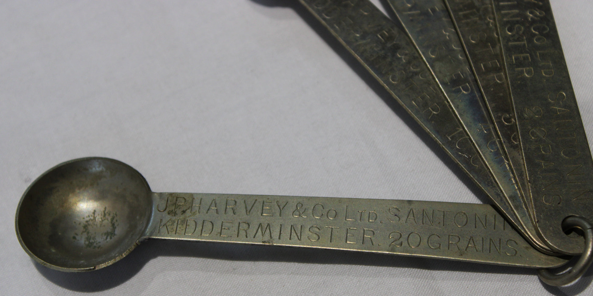 Antique JP Harvey & Co, Kidderminster veterinary Santonin grain measuring spoon set
