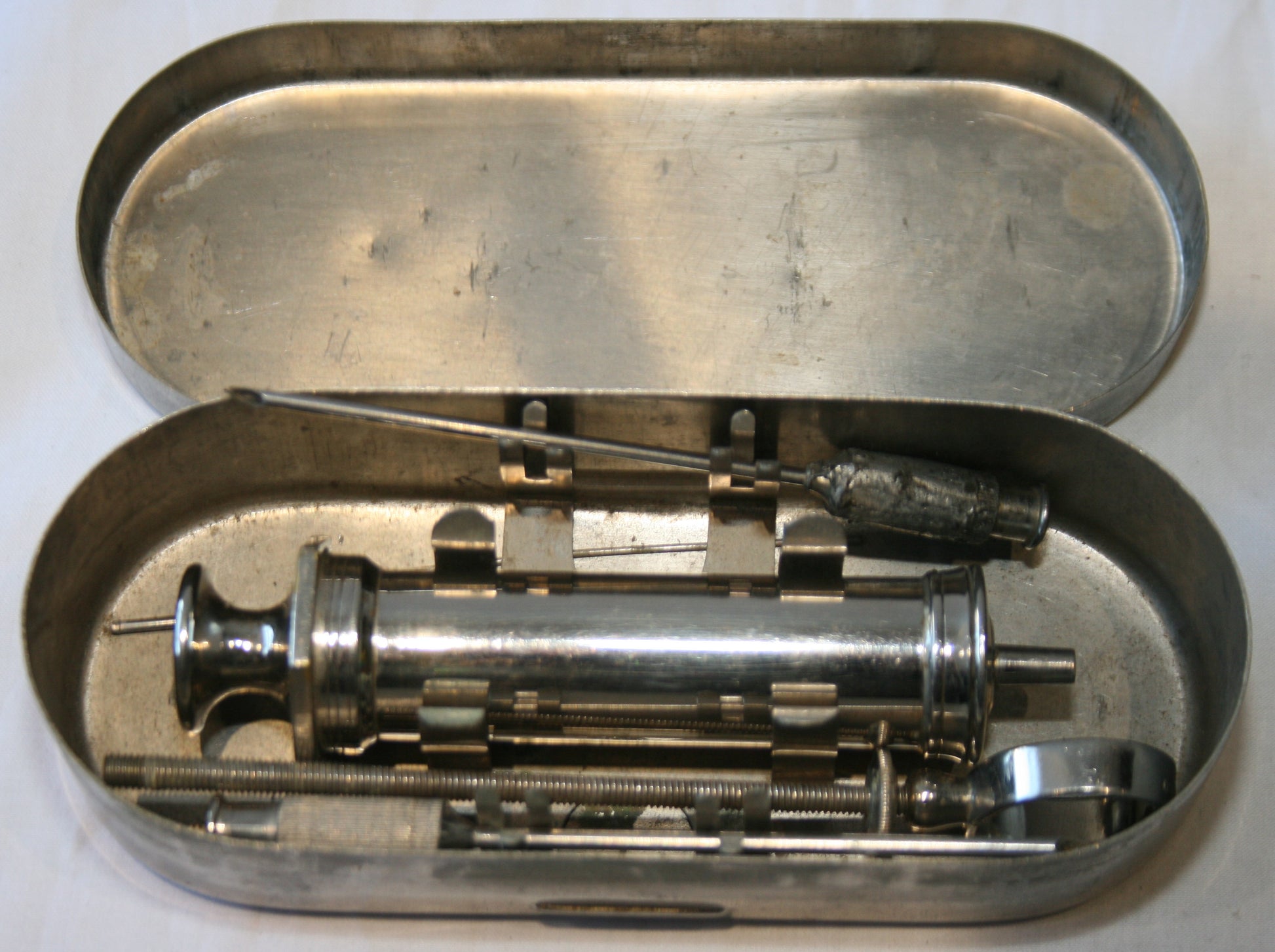 Steel case measures approx. 15 cm, by 6 cm, by 3.5 cm, containing syringe and handle, 2 large needles, and one small needle.