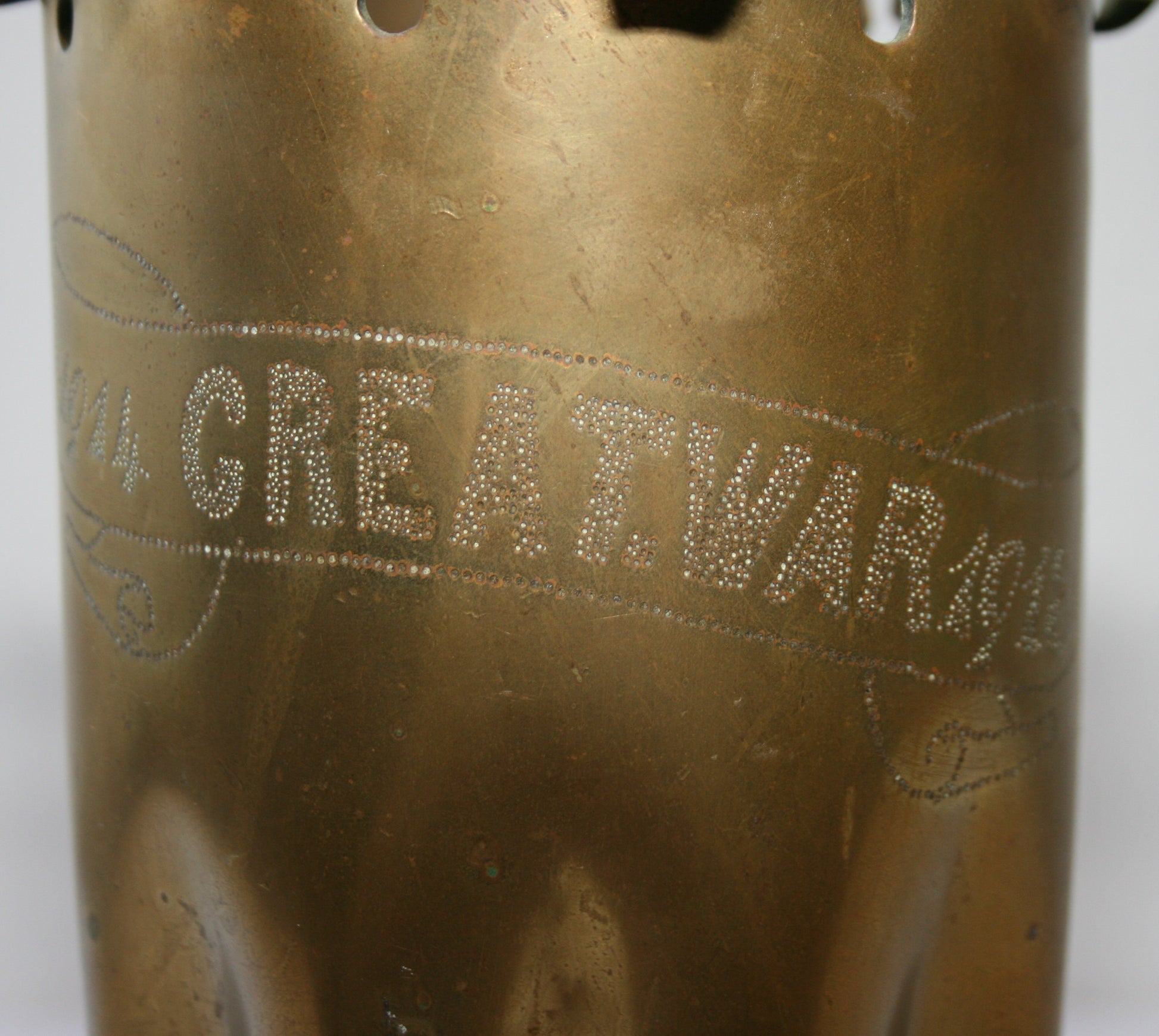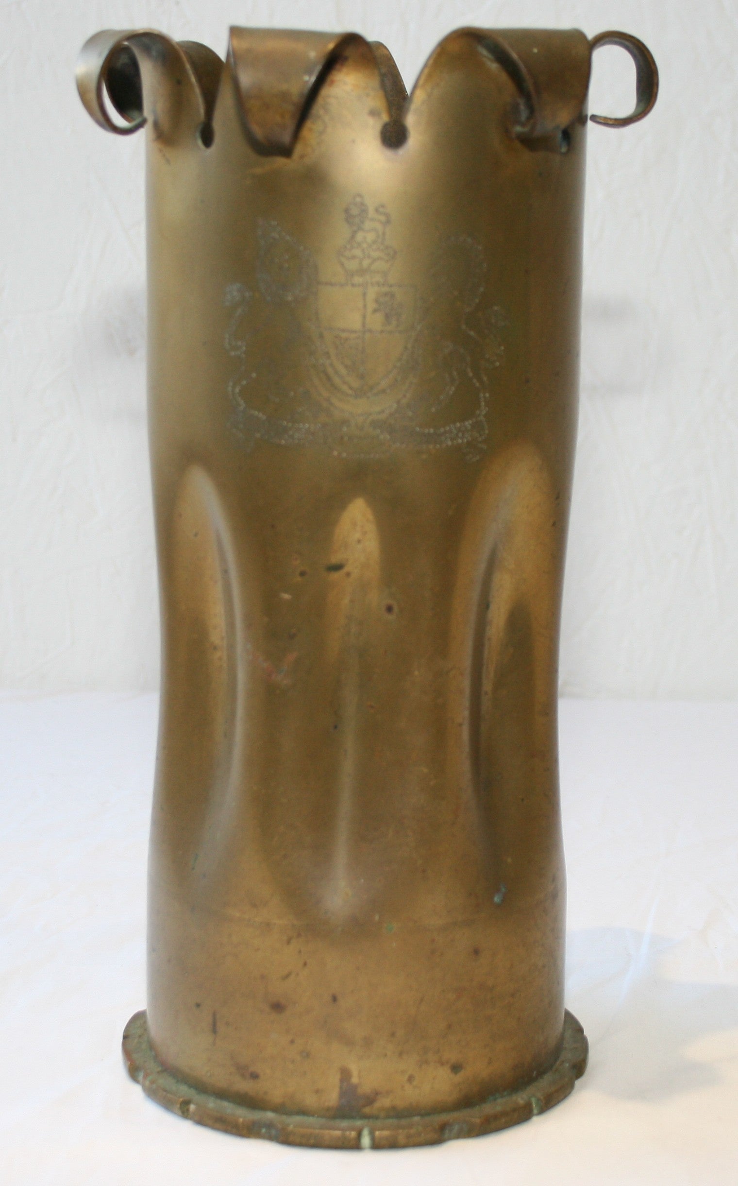 Approx. 13 cm across base, 27 cm tall, with coat of arms to one side, and '1914 Great War 1918' within scroll to the other. Slightly fluted sides, and slightly scrolled points to top.