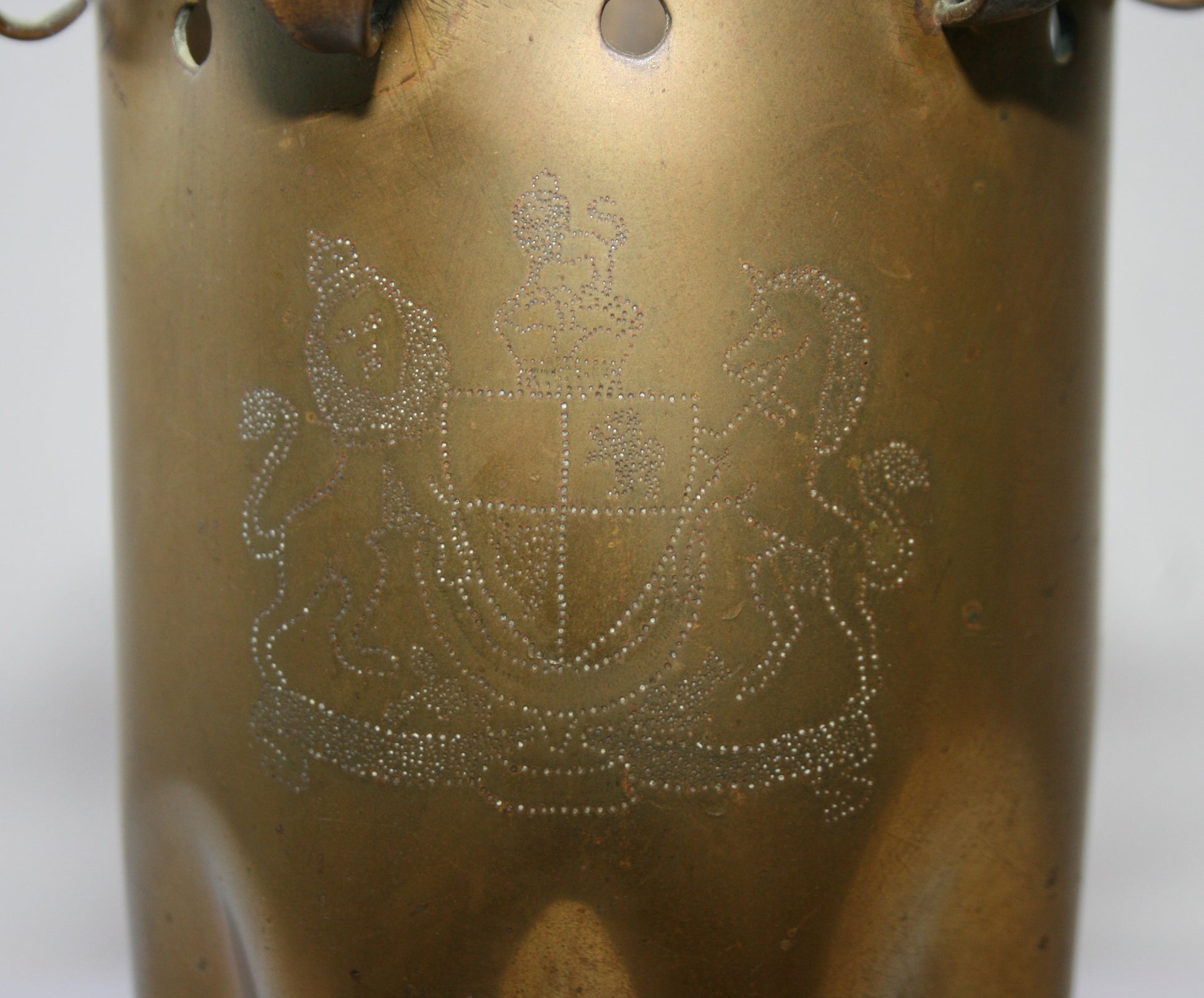 Single 1916 10.5 cm WWI German shell case with coat of arms decoration.