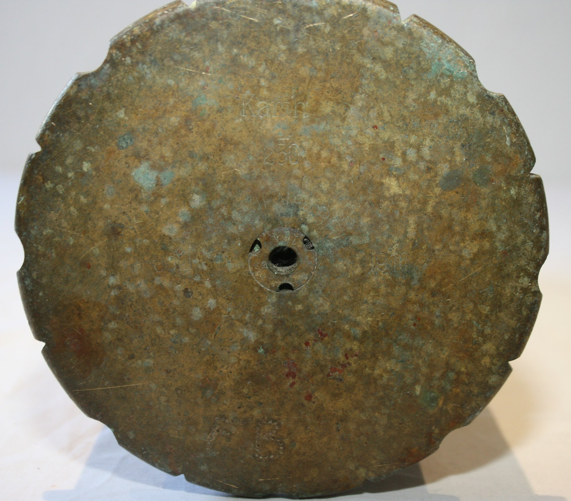 Marks to bottom can just about be read as is, but could do with a clean. Dated 1916, with the word 'Karth' over the number 250. In unpolished condition.