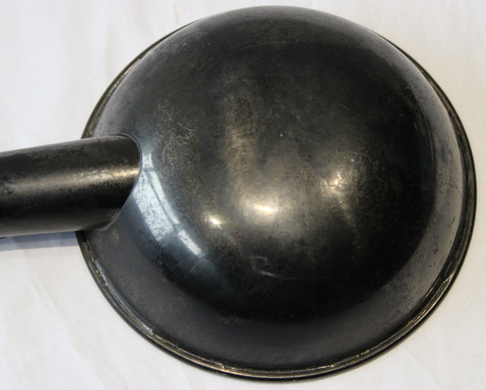 Metal banjo ear trumpet measures 24 cm unextended,, 35 cm extended. Bowl approx 11 cm in diameter.