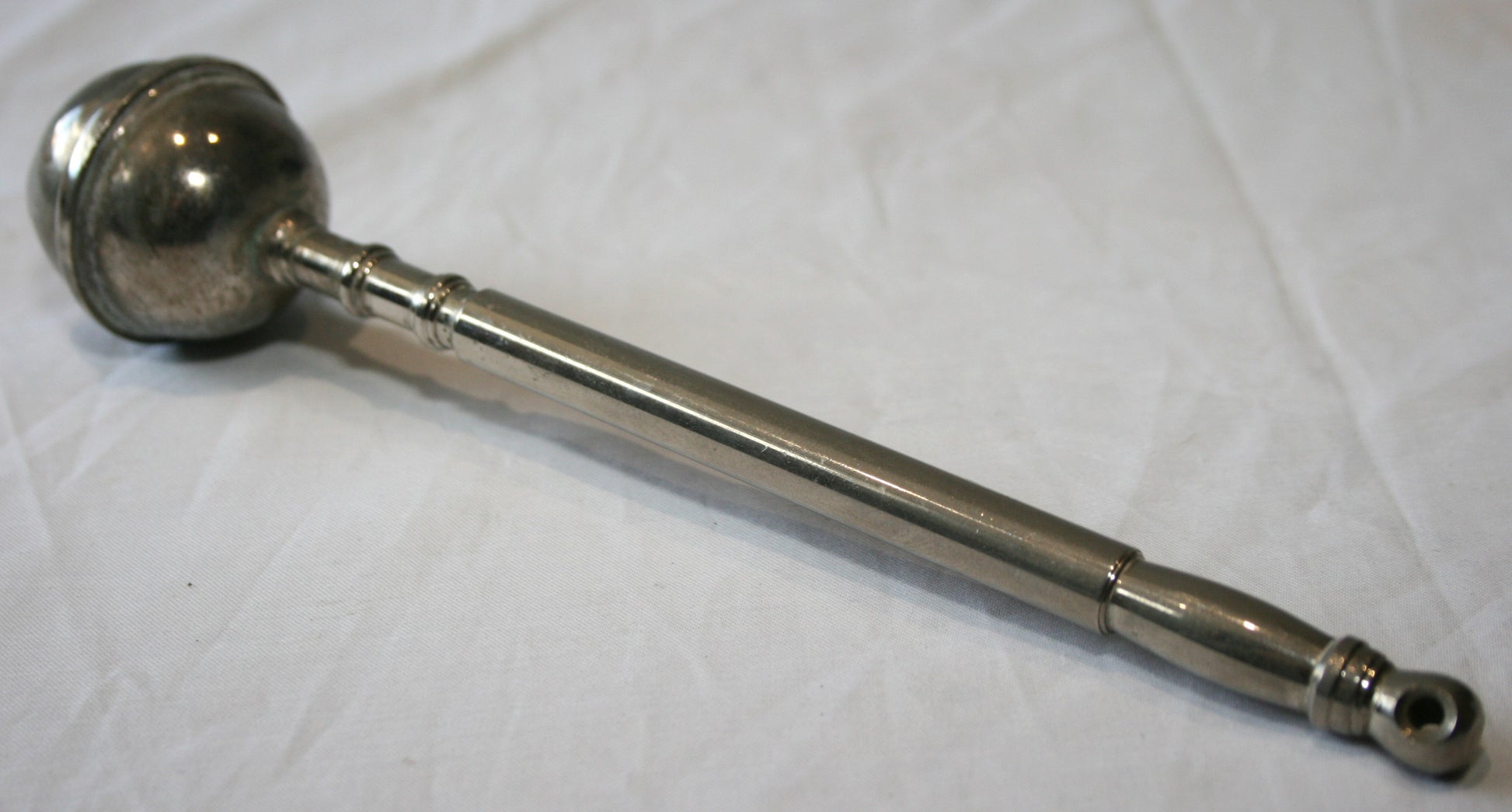 Approx. 8 inches long, with silver plated top (unpolished) with 5 holes for sprinkling. Some small wear marks commensurate with age.